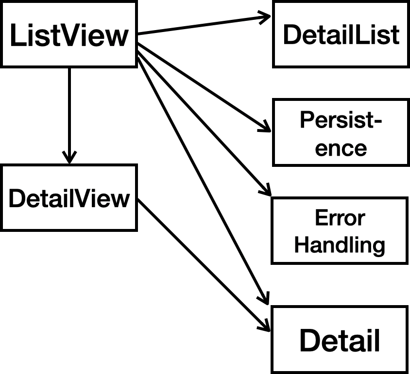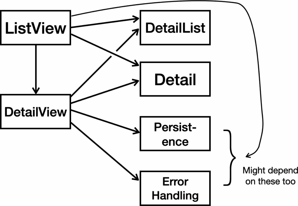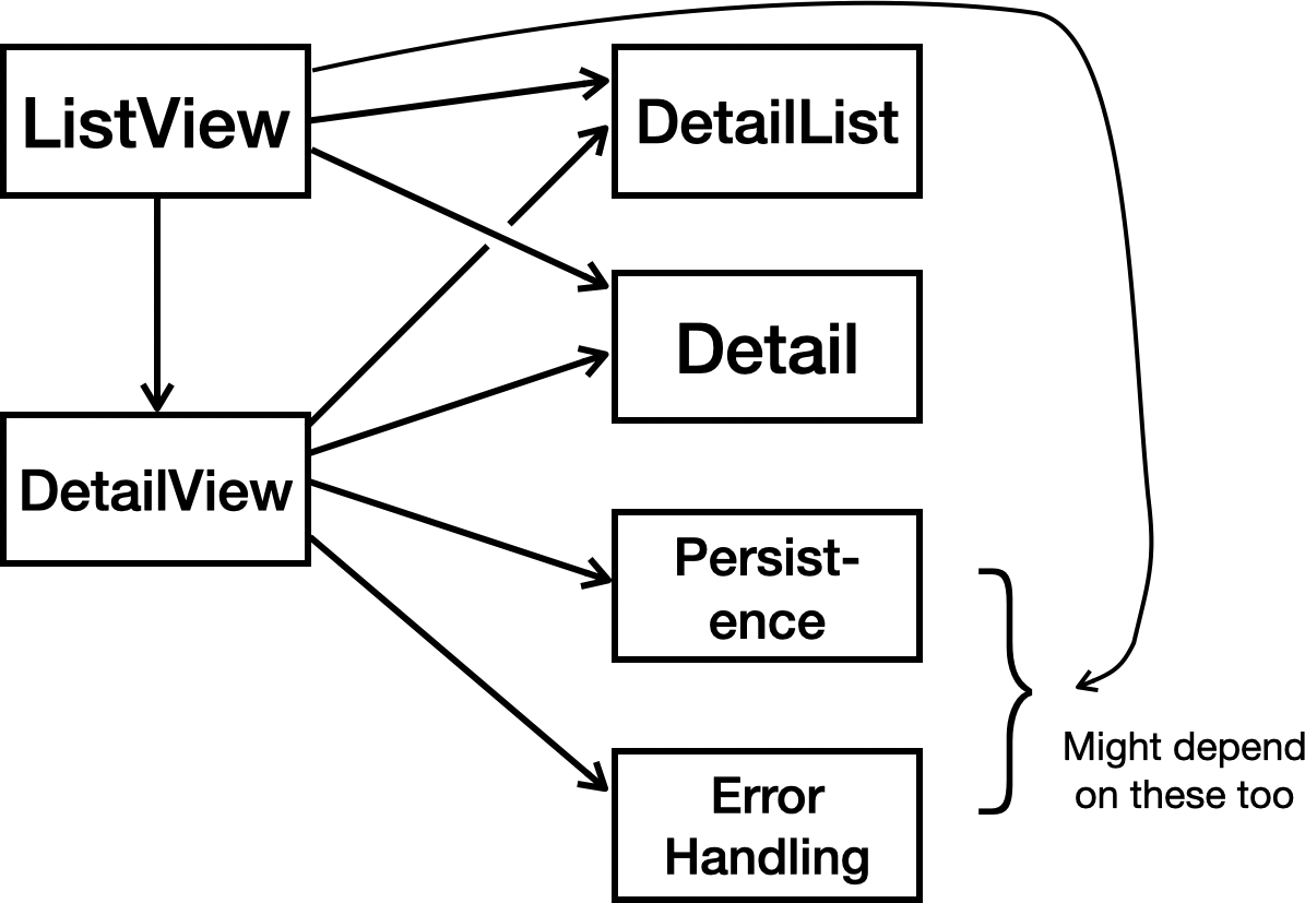 But now we have a circular dependency – ListView and DetailView know each other. But this has a flaw: A change to either affects the other, so they’re inherently unstable.